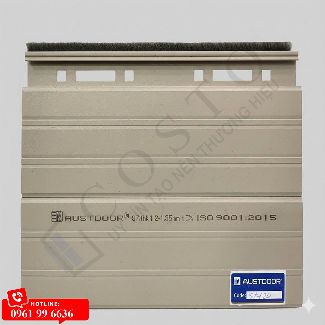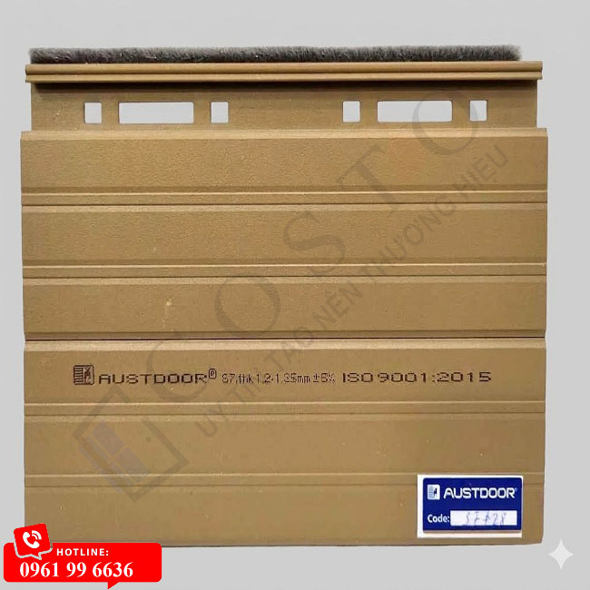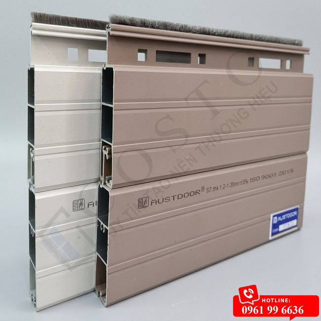 - Trên thân Cửa cuốn khe thoáng Super S7 mặt trước đều được dán tem nhôm màu xanh có tên Austdoor.