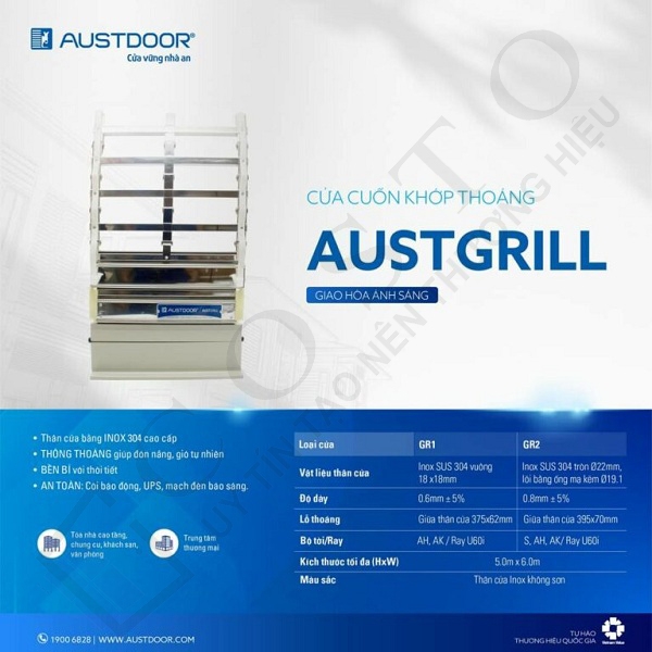 Cửa cuốn khớp inox vuông Austdoor AUST-GRILL được chế tạo từ các vật liệu cao cấp, đảm bảo độ bền và tính thẩm mỹ vượt trội. Dưới đây là một số thông số kỹ thuật của dòng sản phẩm này: